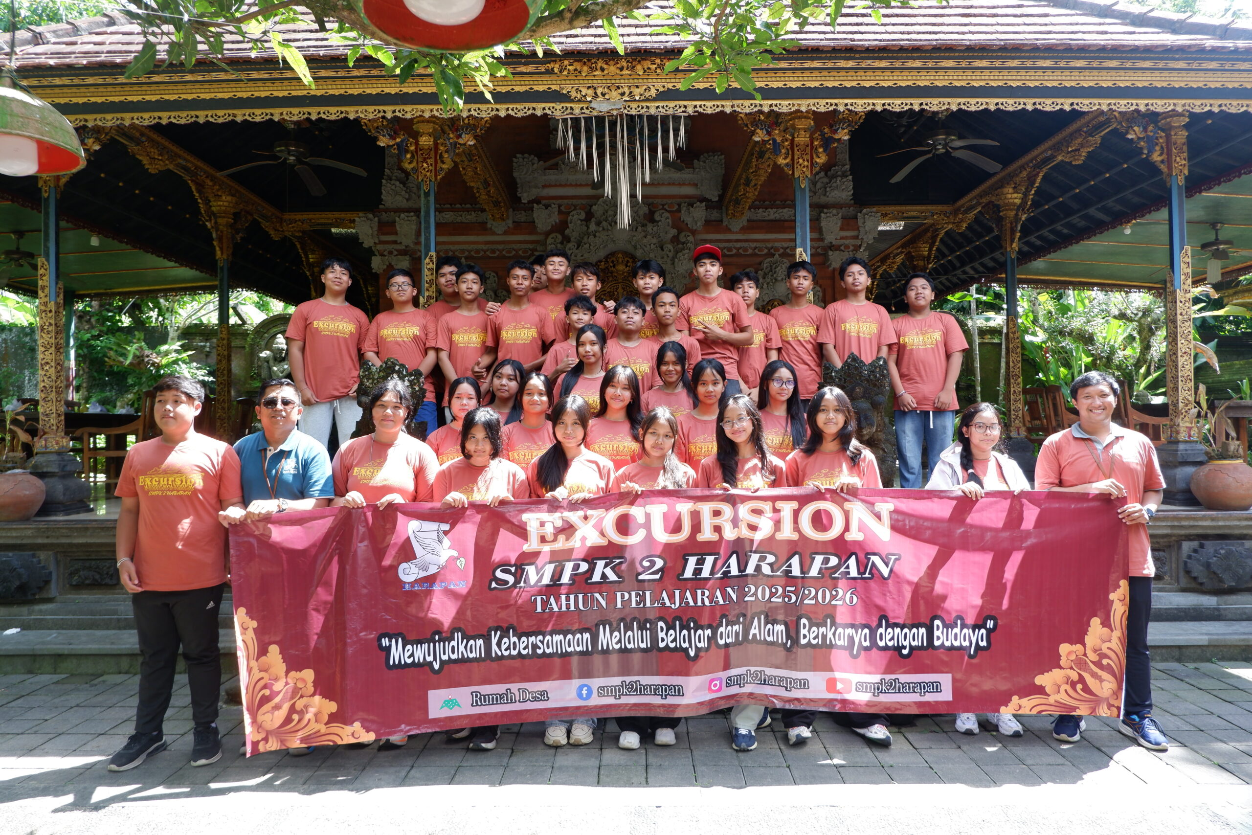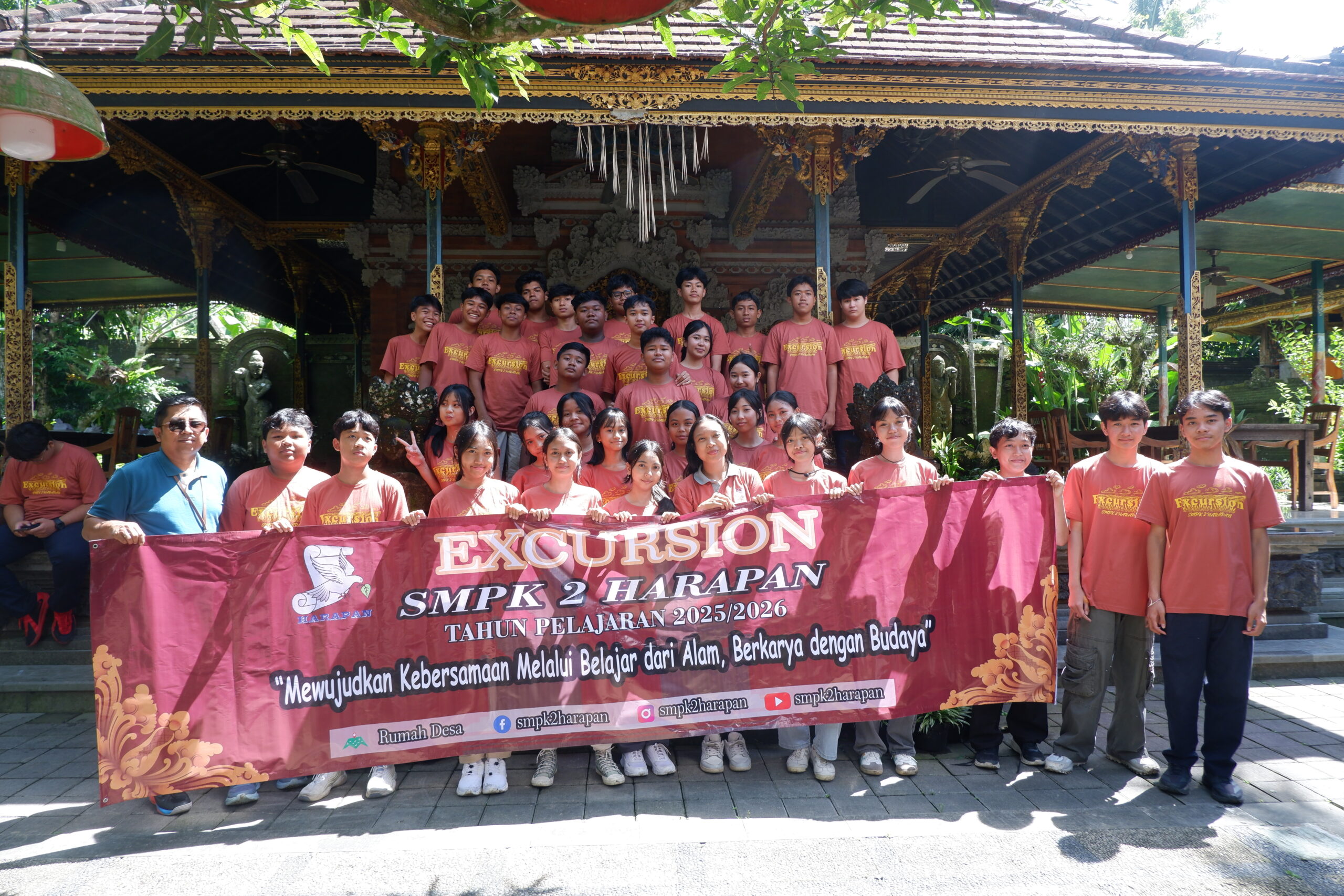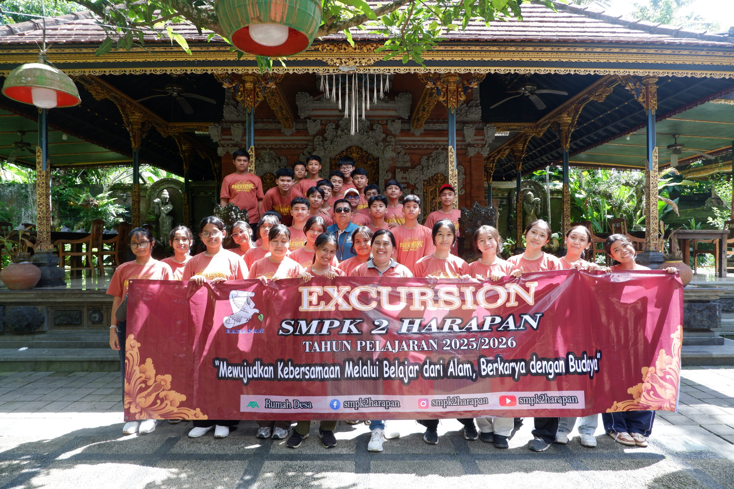 Tabanan, 11 April 2026 – Guna memberikan pengalaman belajar kontekstual dan interaksi langsung dengan lingkungan sekitar, SMPK 2 Harapan sukses menyelenggarakan kegiatan Excursion. Kegiatan edukatif ini dilaksanakan pada hari Jumat, 10 April 2026, bertempat di Desa Wisata Rumah Desa yang berlokasi di Desa Baru, Kecamatan Marga, Kabupaten Tabanan, Bali. Acara ini diikuti secara antusias oleh seluruh siswa kelas VIII, dengan didampingi langsung oleh Kepala Sekolah, staf pimpinan, wali kelas, guru, serta pegawai sekolah.
