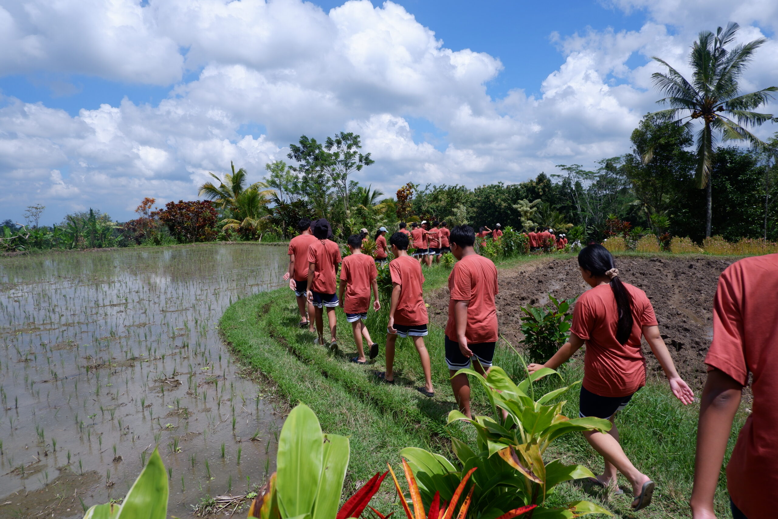 Menjelang siang, agenda dilanjutkan dengan eksplorasi alam dan pertanian. Para siswa melakukan trekking melintasi area persawahan yang asri dan belajar langsung mengenai kehebatan sistem irigasi Subak yang telah diakui sebagai warisan budaya dunia.